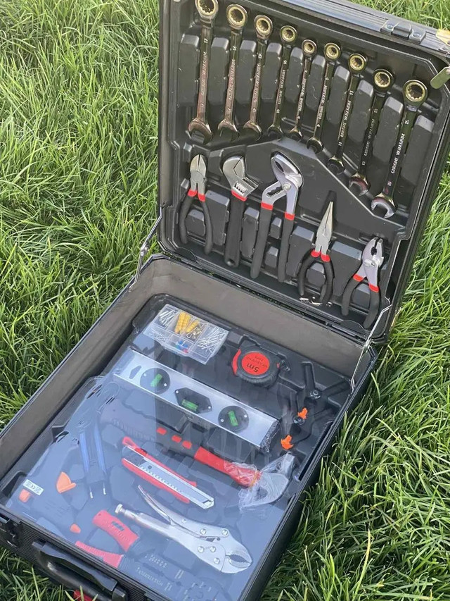 Набір підходить як для регулярного використання, так і для виконання різнопланових робіт завдяки наявності ключів, головок, тріщоток, біт, плоскогубців, молотка та додаткових аксесуарів.